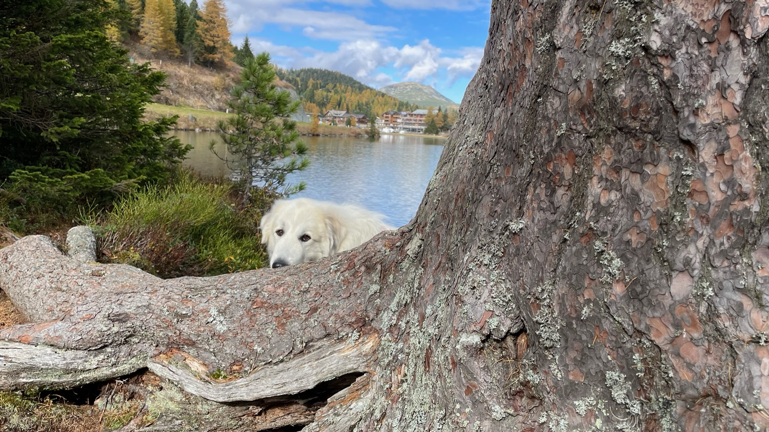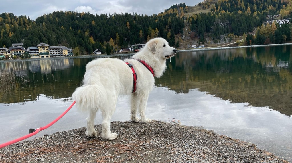 Nach dem Frühstück bin ich mit meinem großen Mensch spazieren gegangen. Ich durfte die Strecke aussuchen. Und ich wollte zum großen Ozean Turracher See. Jajajajajaaa, da ist es ganz schön. Also habe ich meinen großen Mensch den Berg runtergeführt. Und dann sind wir immer am See langgelaufen. Ganz gemütlich. Ich durfte alles beschnuffeln. Und im großen Ozean Turracher See bin ich auch drin gewesen.