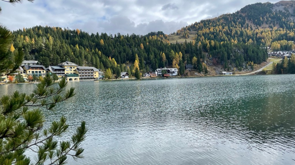 Also geht es den Berg hinunter und zielstrebig zum See. Es ist wolkig, aber trocken. Gelegentlich schimmert auch mal die Sonne zwischen den Wolken durch. Wir wandern erstmal gemütlich Richtung Seehotel „Jägerwirt“ um den See.