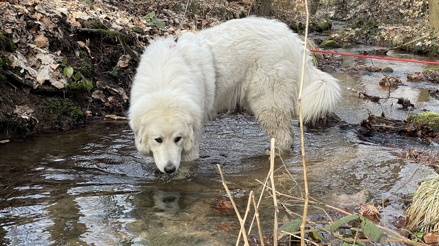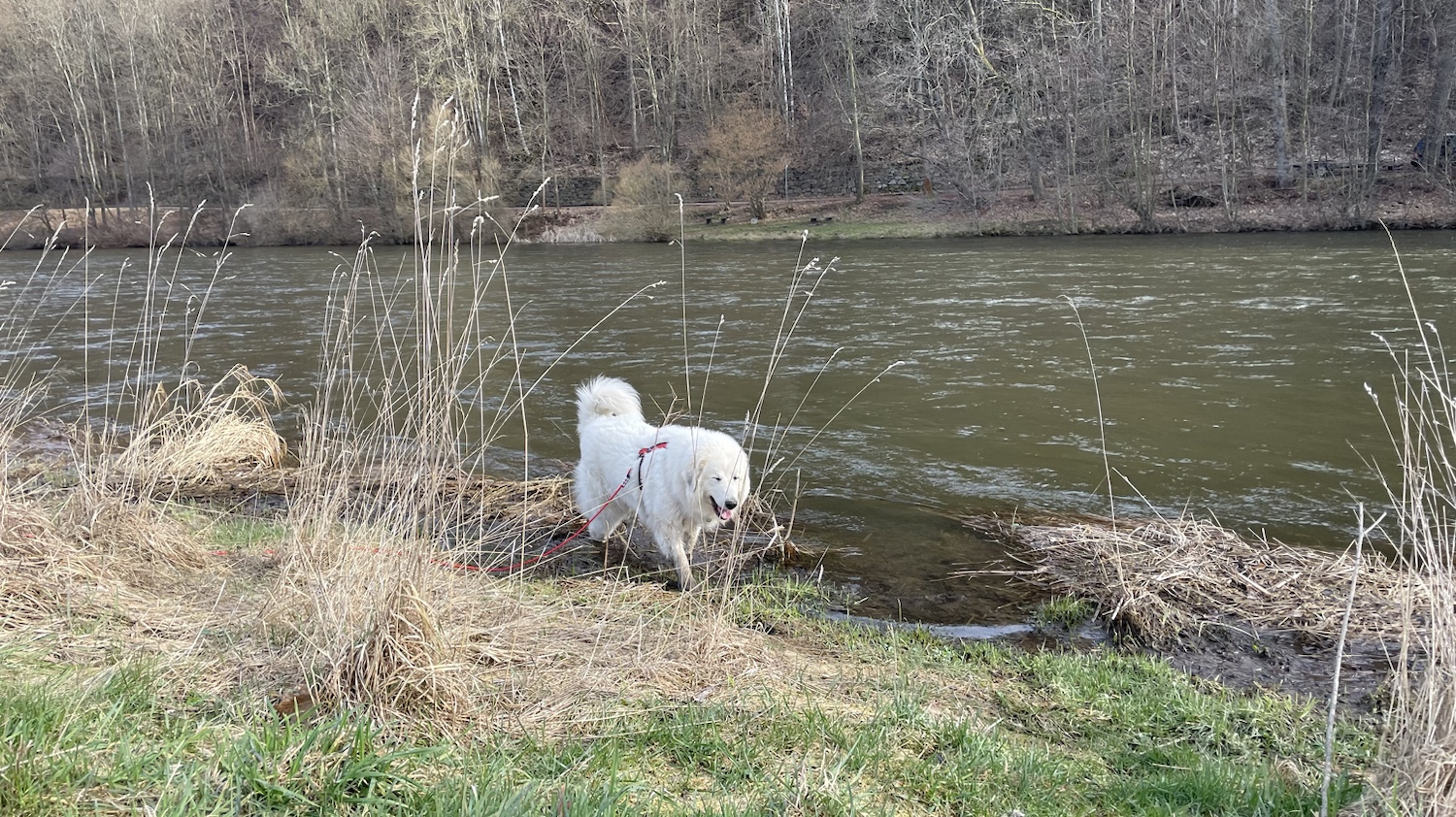 Auf der anderen Flußseite habe ich mich erstmal ausgeruht und was gefuttert. Und dann sind wir noch beim Kalle gewesen und danach ging es wieder über den Feldweg gemütlich nach Hause. Dort habe ich mich ausgeruht. Den ganzen Tag. Nur manchmal mußte ich jemanden ausschimpfen, weiiil, das ist meine Aufgabe. Ich bin eine Herdenschutzhündin! Eine Pyrenäenberghündin bin ich!
