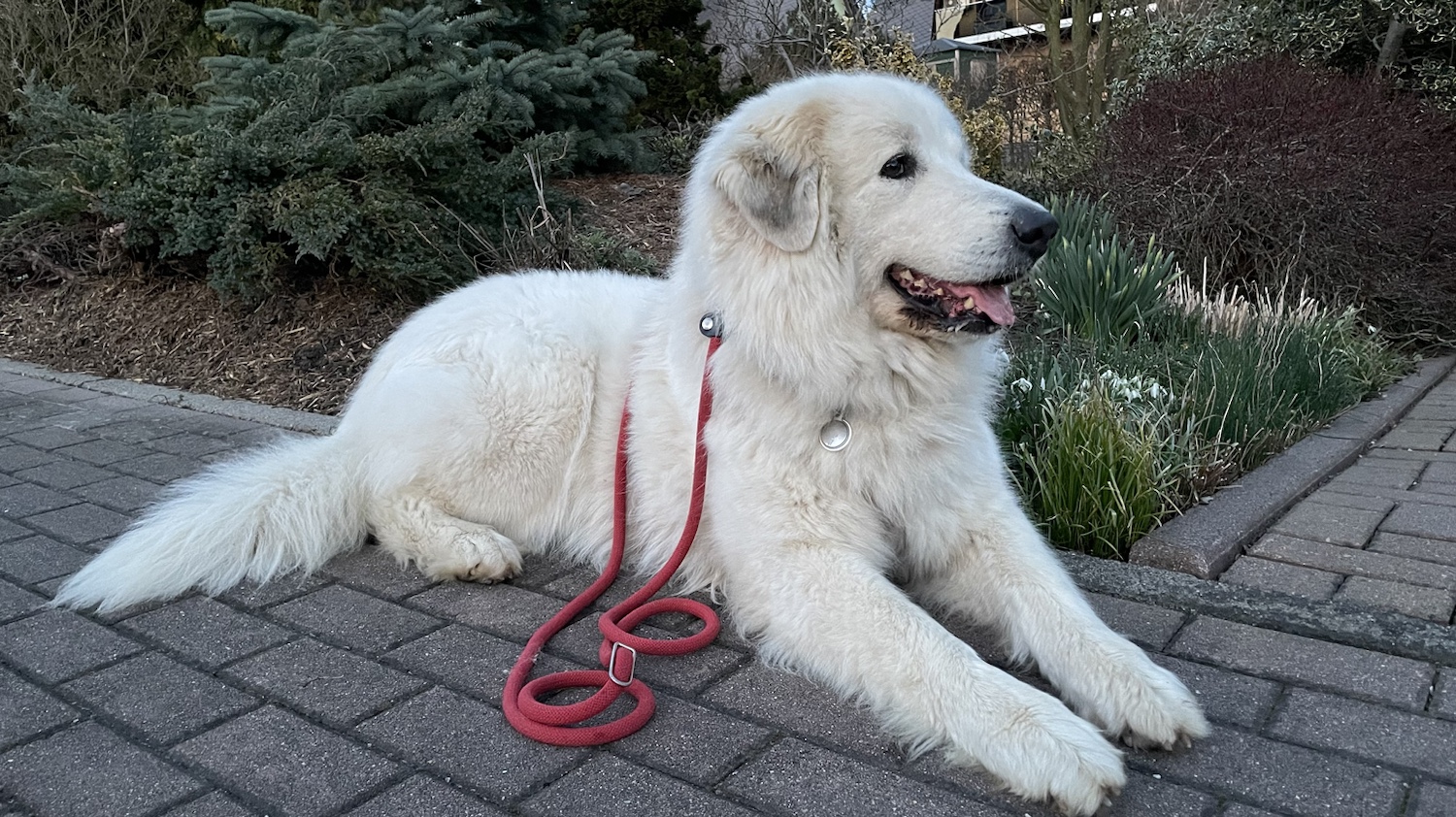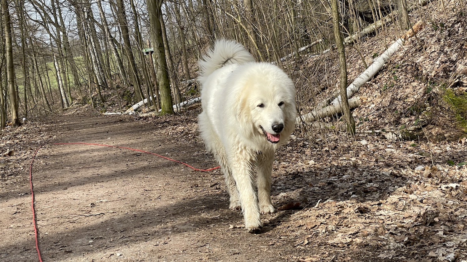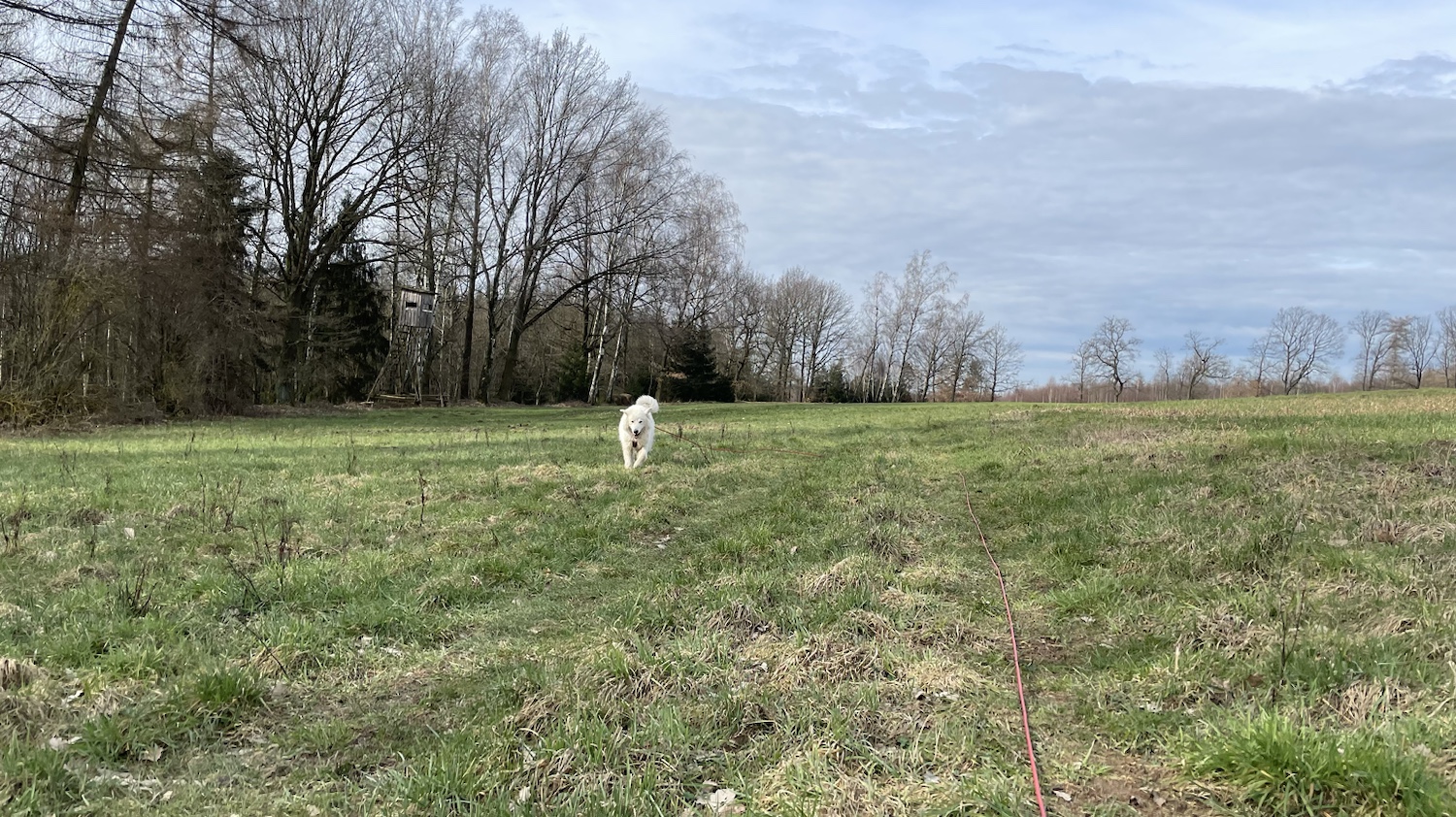 Mein großer Mensch wollte dann am großen Fluß mit dem komischen Namen – Tschooo-Pauuu, falls ihr das nicht mehr wißt – über die Wackelbrücke drüber. Da habe ich aber gesagt, Nönönönönööö, das ist mein Frühlingsspaziergang und da gehen wir immer schön am großen Flußufer lang. Und da mußte er mit mir mitkommen, weiiil, er hing ja an meiner schönen langen roten Feldleine. Ich habe nämlich jetzt wieder eine rote. Die ist viel besser als die orangene, die ich zwischendurch mal hatte. Die hat sich immer verheddert und verknotet, was die eigentlich gar nicht darf, und das hat meinem großen Mensch gar nicht gefallen. Und deshalb habe ich wieder eine rote, die macht sowas nicht. Ja, und an der hängt mein großer Mensch immer dran und deshalb kann er nur so laufen wie ich.