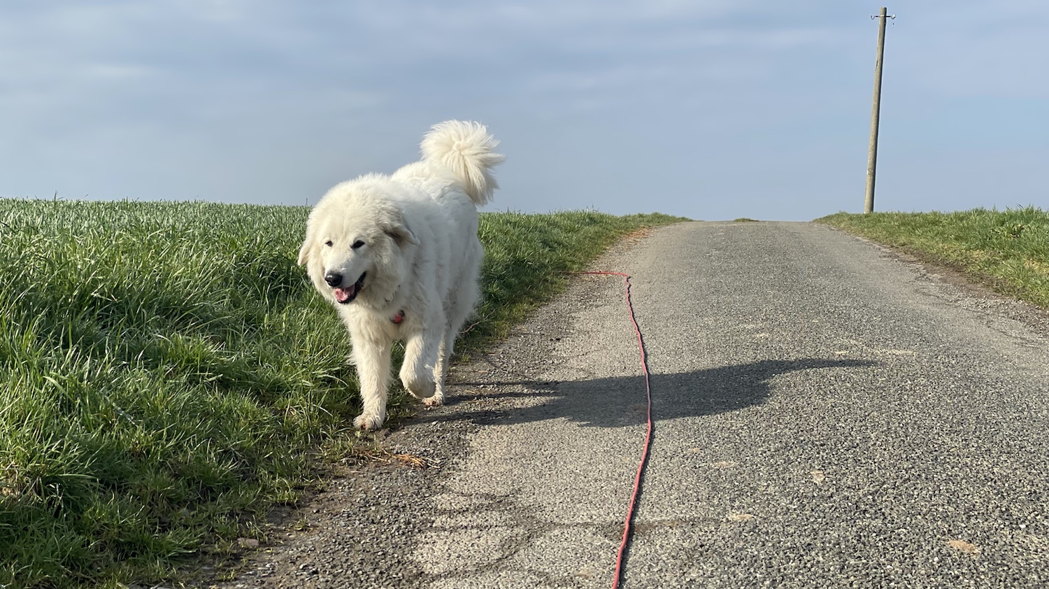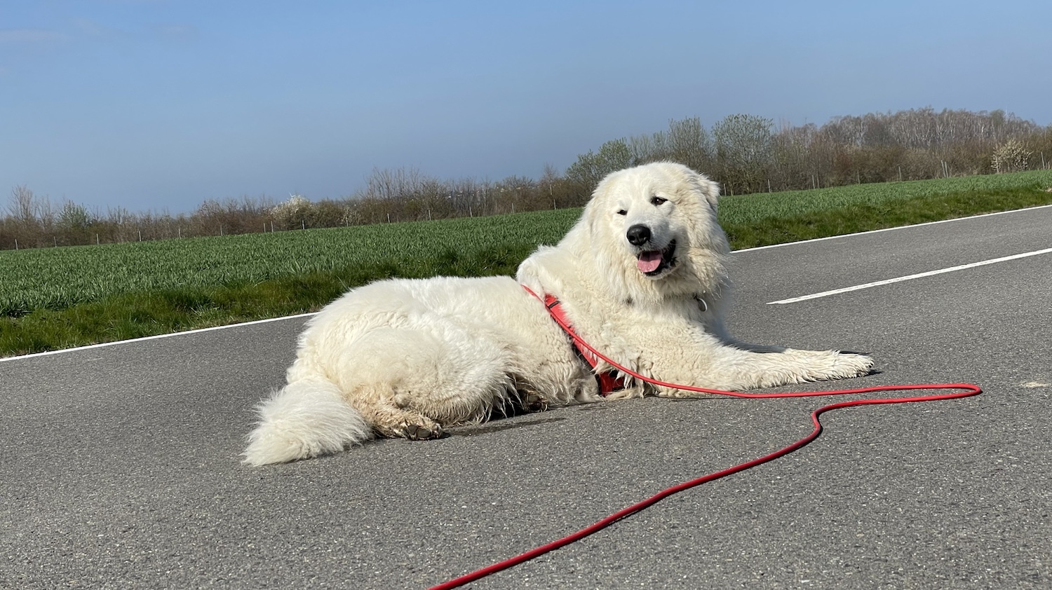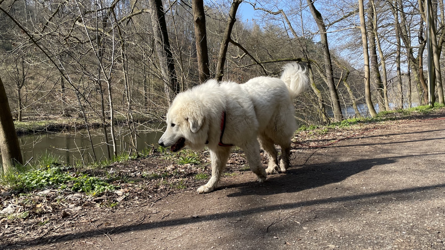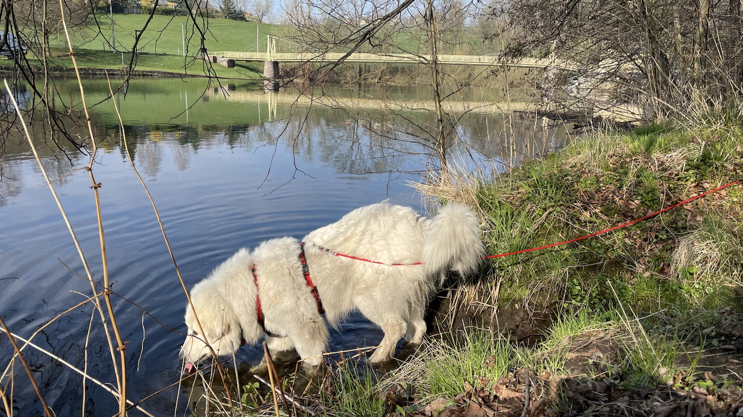 Dann sind wir nach Kockisch gelaufen. Da habe ich den Wim getroffen. Der war in seinem Garten. Und dann sind wir weiter zur großen Wackelbrücke und da drüber auf die andere Seite vom großen Fluß mit dem komischen Namen. Und ich habe überall geschnuffelt. Auf der anderen Flußseite sind auch zwei Hunde spazieren gegangen. Die waren aber nicht so große wie ich. Ich bin eine sehr große Hündin. Eine Pyrenäenberghündin bin ich.