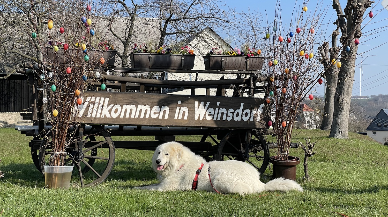 Dann sind wir den Berg hoch, ich habe immer noch nach den Rehen geguckt, und dann weiter ein Stück den Forstweg entlang und dann haben wir auf dem Feld das Reh gesehen. Mein großer Mensch hat mich gleich gelobt, weiiil, ich hatte Recht. Da war ein Reh. Wir sind dann schön weiter über das Feld und nach Weinsdorf und da habe ich eine kurze Pause gemacht und dann am Feuerlöschteich habe ich nochmal zwei Enten verjagt.