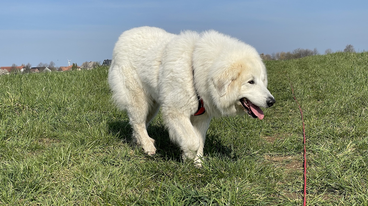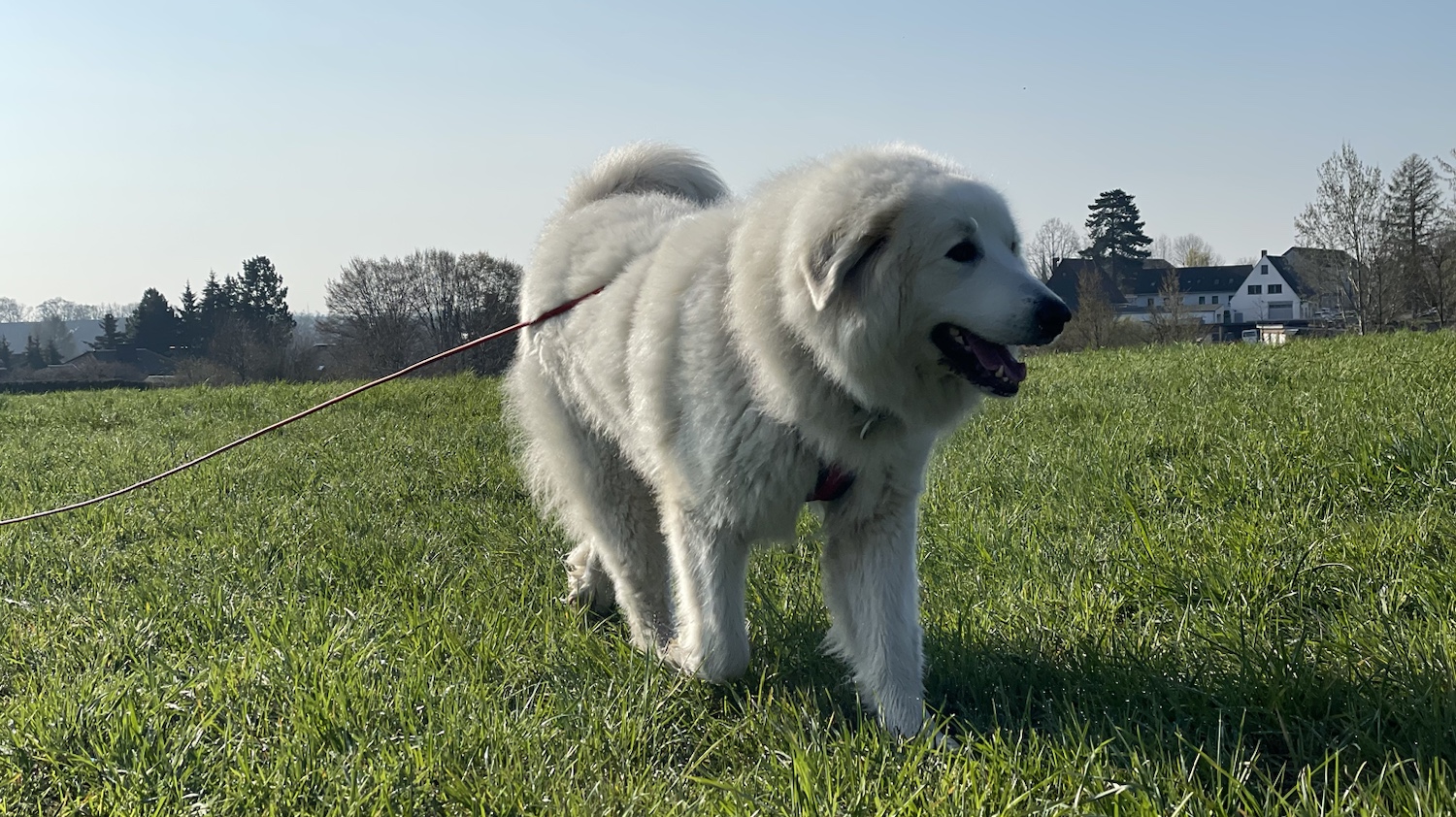 Zu Hause mußte ich dann unter die Dusche. Da hat mein großer Mensch meinen ganzen schönen Rehduft weggeduscht. Pitschnaß bin ich gewesen. Aber es war ja schönes Sonnenwetter, da bin ich ganz schnell wieder getrocknet. Eine ganz große Runde war das. 11 Kilometer. Das ist ganz schön viel für eine kleine Pyrenäenberghündin wie die Bella.