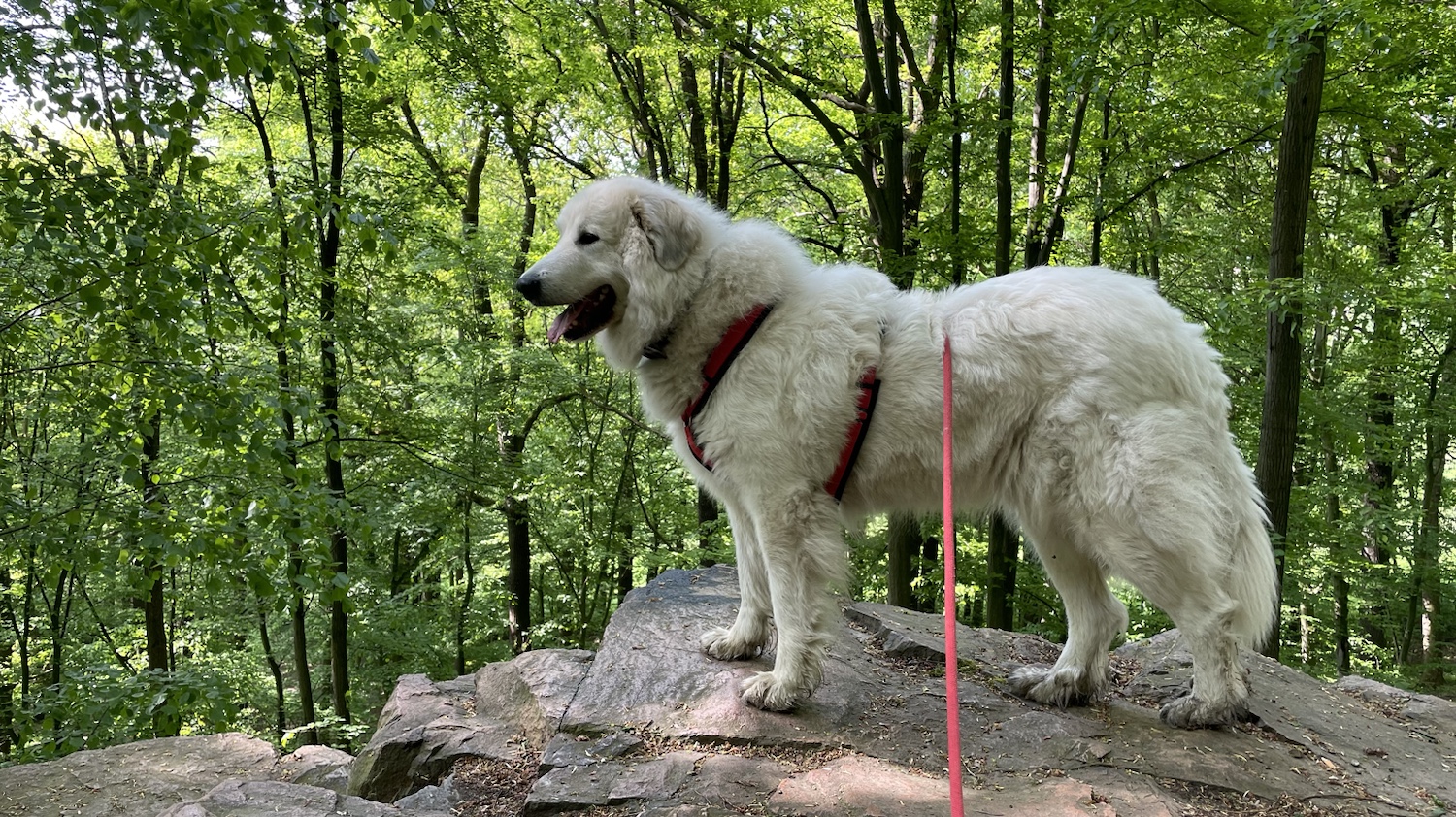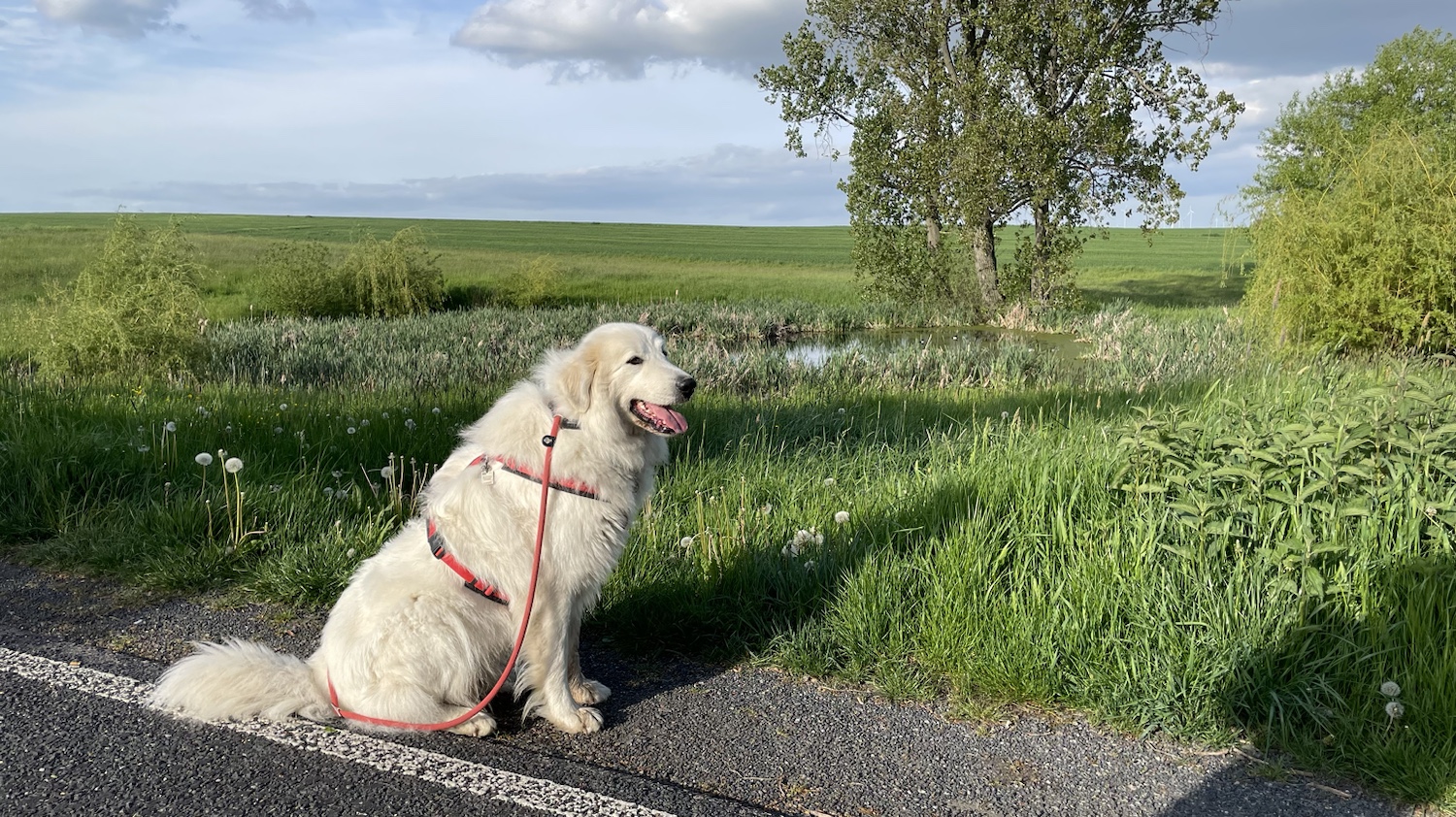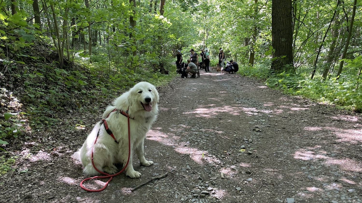 Nachmittags sind wir mit meinem weißen französianischen Auto zum Gruppenspaziergang mit meiner Hundeschule gefahren. Siebzehn Hunde waren wir. Drei ganz neue. Die waren aber alle drei ganz lieb. Wir sind eine ganz schöne große Runde gewandert. Durch Wald und über Felder und auf der Straße und wir konnten auch immer mal ins Wasser zum Baden und Trinken. Das war ganz sehr schön.