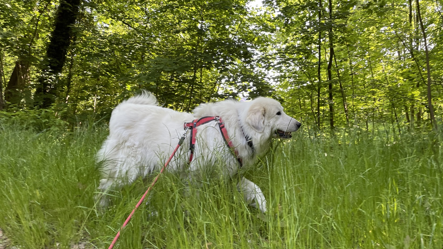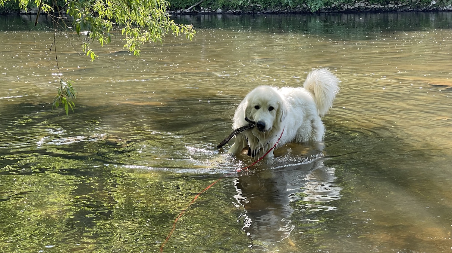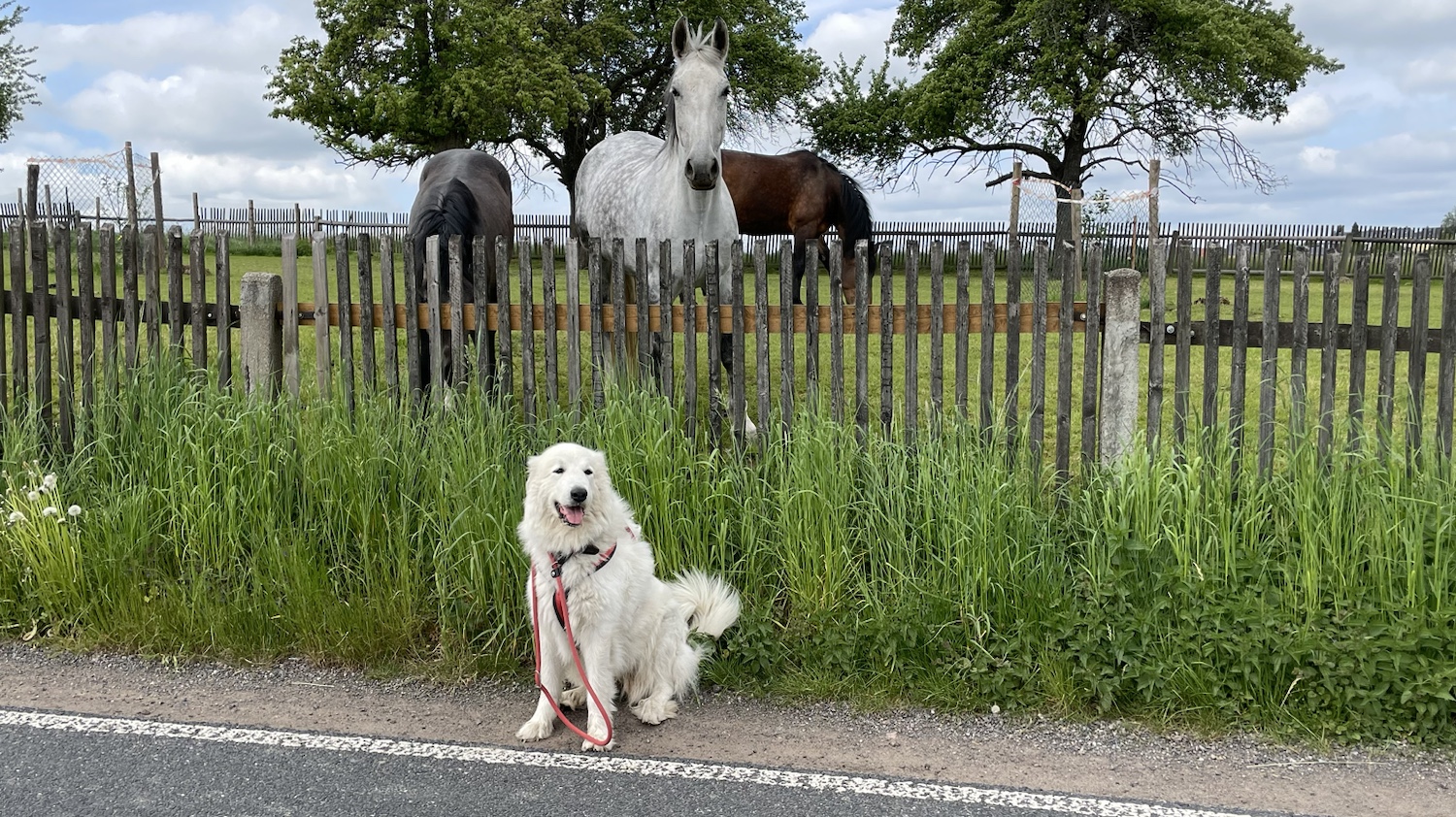 Auf dem Heimweg war ich dann noch in einem kleinen Bächlein und da habe ich einen Stock aus dem Wasser gezerrt und dann sind wir die Straße langgelaufen und ich war bei den Pferden. Die sind gleich wieder zu mir an ihren Zaun gekommen. Über die große Wiese sind wir dann zurück durch mein Wohngebiet nach Hause gelaufen.