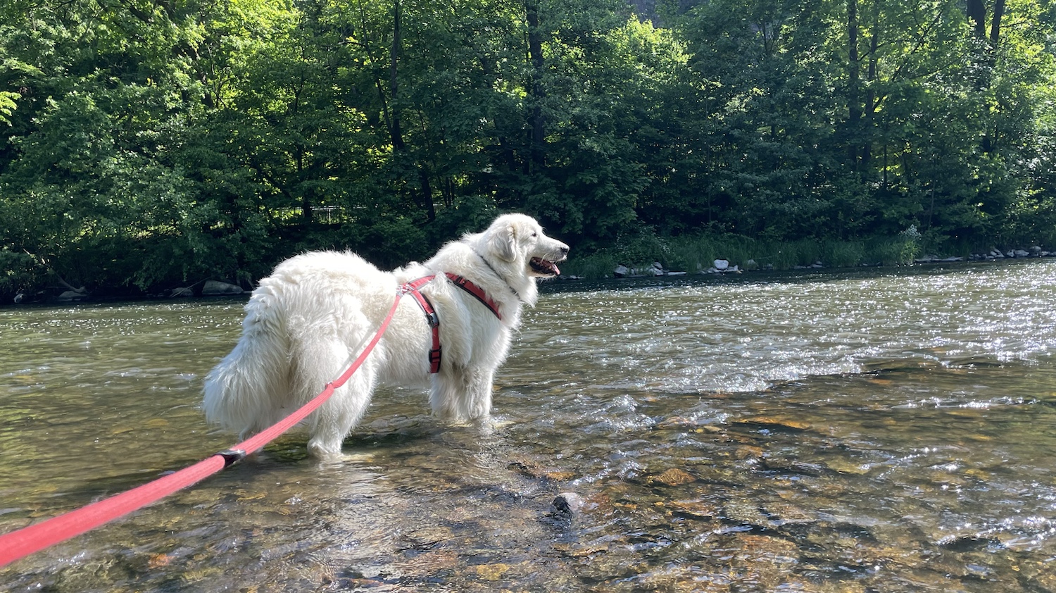 Wir sind eine ganz große Runde gewandert und waren wieder am großen Fluß mit dem komischen Namen. Ich konnte da schön baden gehen und meine Pfötchen kühlen und auch was trinken. Und in ein Zeckennest bin ich gelatscht. Da hatte ich ganz plötzlich ganzganz viele Zecken an meinen kleinen Pyripfötchen. Mein großer Mensch hat die alle gleich weggemacht.
