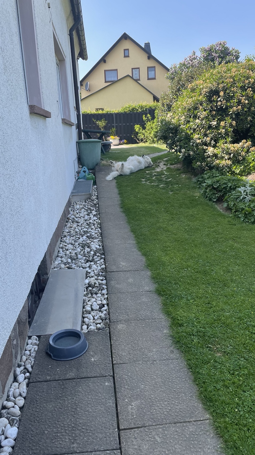 Nach dem Spaziergang sind wir nach Hause gefahren. Ich war mit meinen Menschen den ganzen restlichen Tag in meinem Garten. Menschenomi und Menschenopi waren auch mit mir auf der Terrasse. Da ist es schön schattig. Und zum Kaffee habe ich von meinem großen Mensch auch was zu knabbern bekommen. Und mit meiner großen Menschenschwester habe ich auch wieder gekuschelt. Das ist schön!