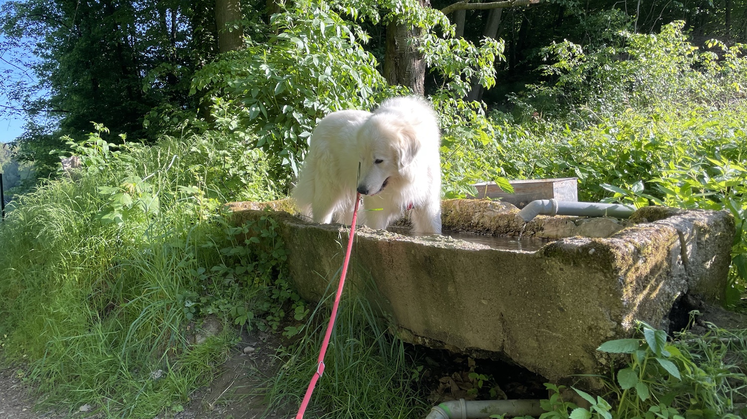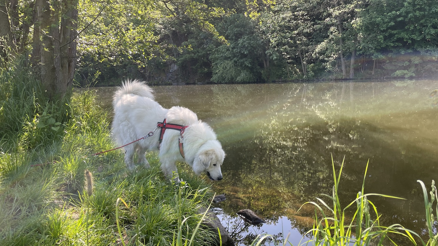 Mein großer Mensch mußte heute abends mal nicht weg. Und da habe ich die Gelegenheit genutzt und mir eine ganz große Abendrunde ausgesucht. Ich durfte nämlich wieder führen. Wir sind durch die Siedlung gegangen und dann zum großen Fluß mit dem komischen Namen. Dann habe ich meinen großen Mensch über die Wiese und den Berg hoch durch den Wald geführt. Wir sind dann aber nicht zum „Waldhaus“ abgebogen, sondern in die andere Richtung. Ich habe in der großen Wasserwanne erstmal was getrunken.