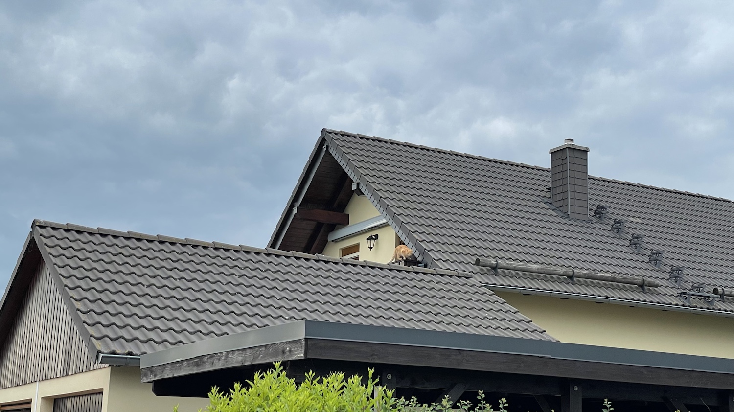 Am Freitag war es ganz warm. Da haben wir nur einen kleinen Abendspaziergang durch mein Wohngebiet gemacht. Und da habe ich was ganz lustiges gesehen. Eine rote Mietzekatze. Aber nicht auf der Treppe vor der Haustür, wo sie hingehört, sondern ganz weit oben auf dem Haus.