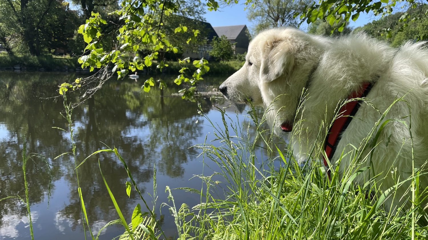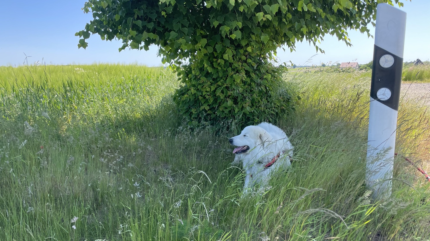 Wir sind dann weiter den Weg entlang bis zu den Rehen gegangen. Die haben aber bestimmt schon geschlummert. Zumindest war keins zu sehen. Dann bin ich mit meinem großen Mensch den Feldweg bis zum Teich gelaufen. Dort habe ich nochmal was getrunken und dann sind wir über die große Wiese hinter meinem Wohngebiet und durch mein Wohngebiet wieder nach Hause gegangen.