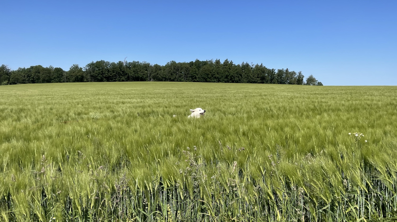 Wir sind dann ein kleines Stück den Forstweg lang zum Feld. Auf dem Weg habe ich ein Bein gefunden. Vom Reh. Das lag da im Gras am Wegrand. Durfte ich aber nicht knabbern, da habe ich es liegen gelassen. Auf dem Feld bin ich dann durch das hohe Getreide gehüpft. Aber nur ein ganz kleines Stück.