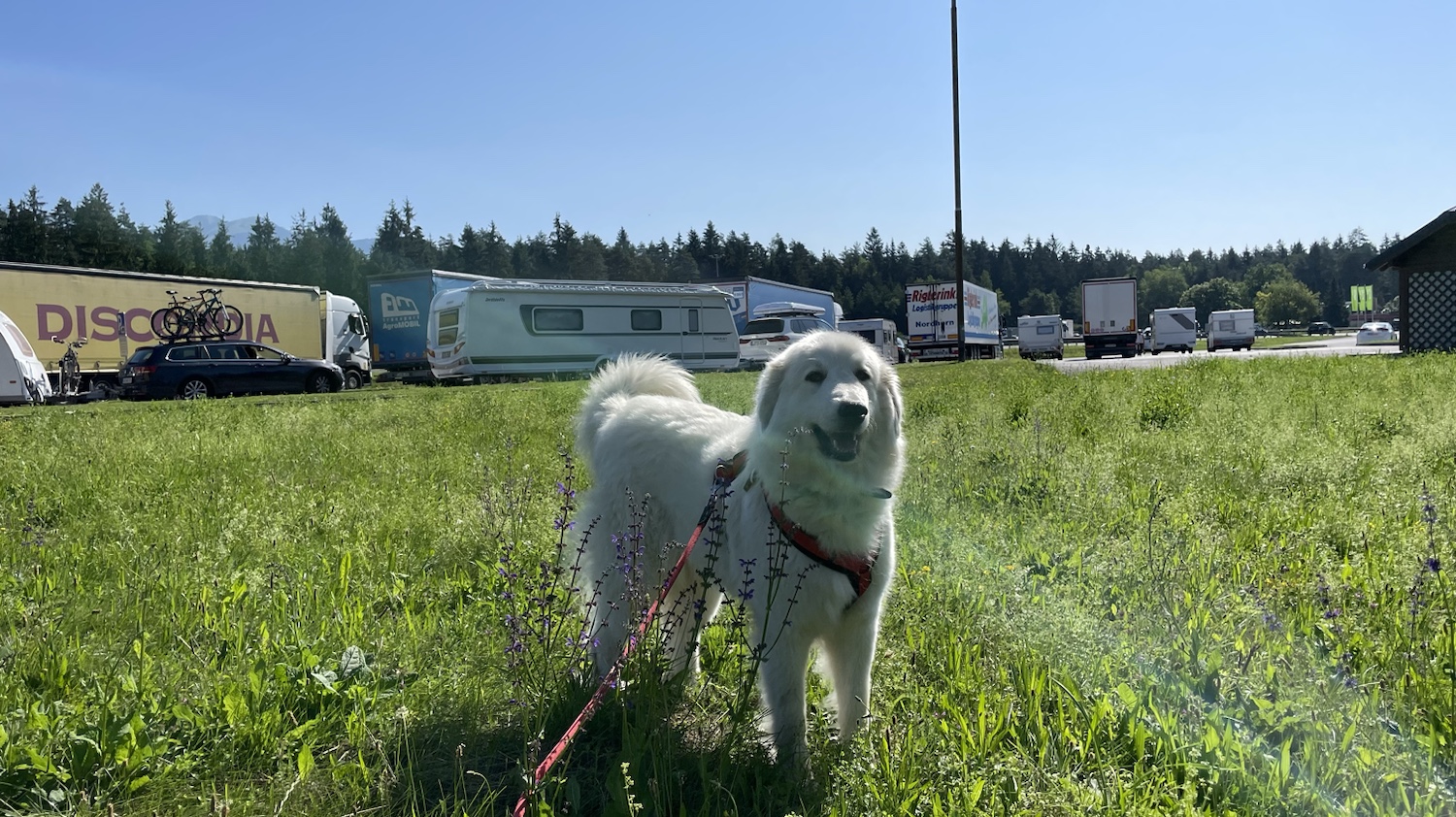 Danach ging es immer weiter und da haben wir nochmal eine Pause gemacht. Da sind wir aber schon in Slowenien gewesen. Das ist genau zwischen dem Österreich und Kroatien und was soll die Bella sagen, das war wieder genau der selbe Rastplatz mit der großen Wiese, an dem wir voriges Jahr schon eine Pause gemacht haben. Zufällig.