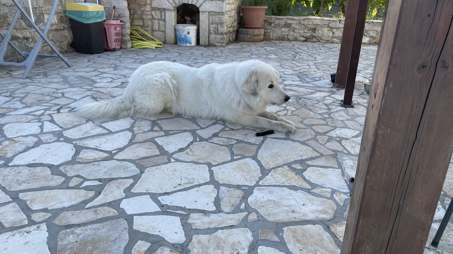 Dann gab es unser Abendfutter. Draußen auf der Terrasse am Pool. Ich habe auch was bekommen. Zum Knabbern. Und ganz zum Schluß noch Käse. Und danach bin ich eine Abendrunde mit meinem großen Mensch gelaufen. Da sind uns viele Hunde begegnet. Auch meine Freundin von vorigem Jahr. Die hat wieder wild am Zaun geschimpft. Aber das wird noch ruhiger. Weiß ich vom vorigen Urlaub.