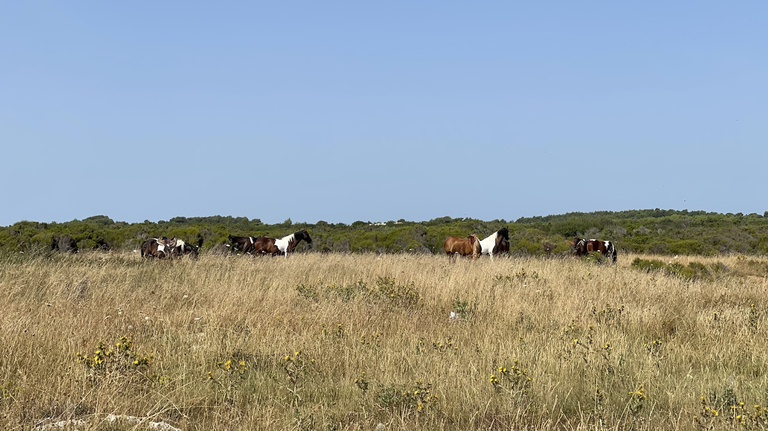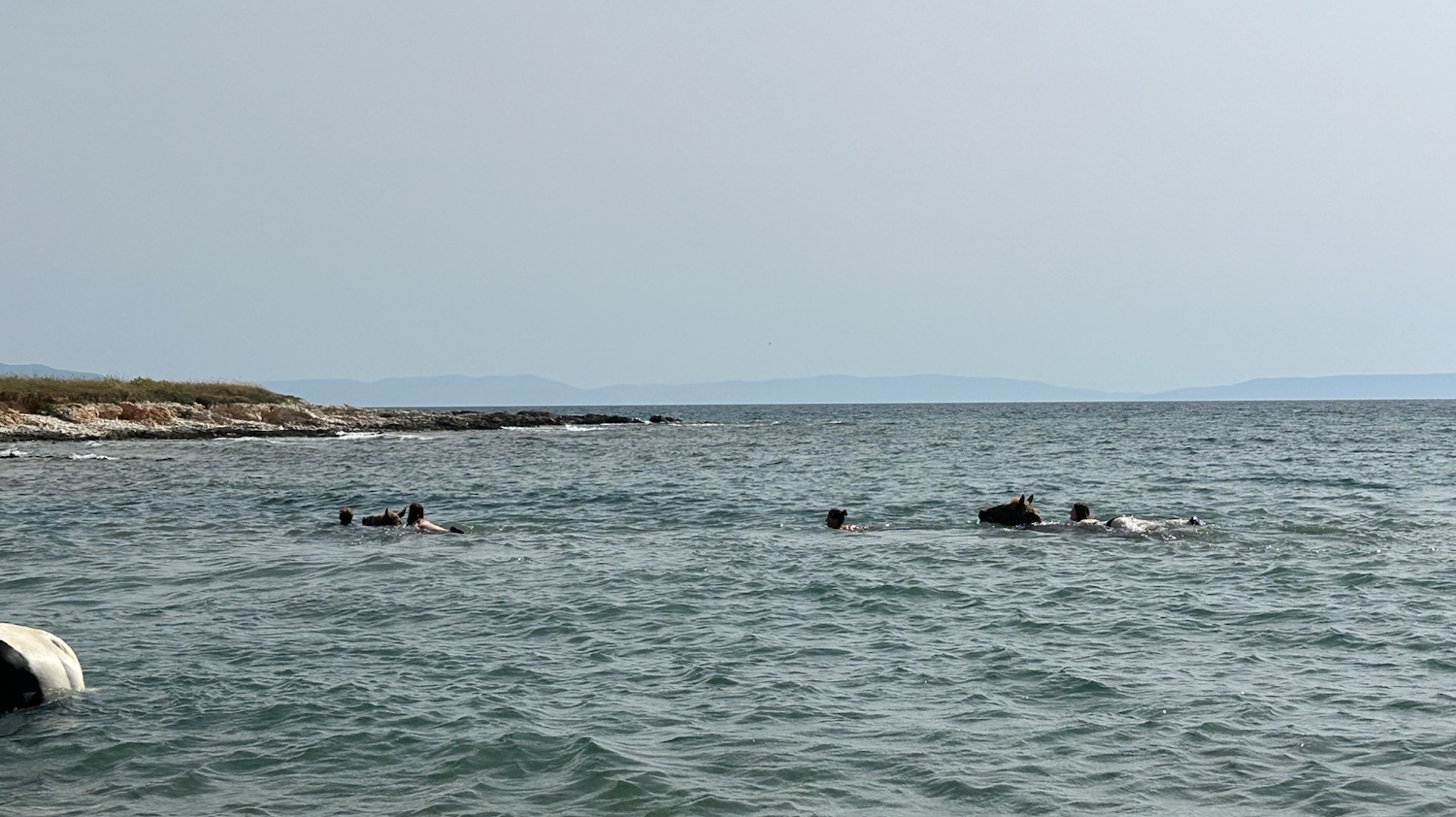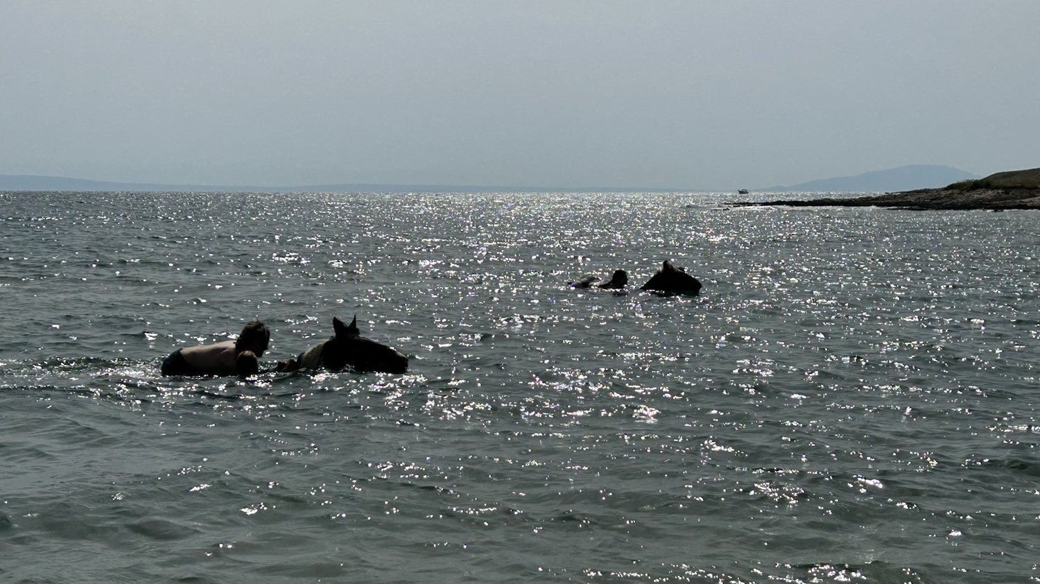 Dann treffen auch die Reiter ein. Die Pferde werden abgesattelt und drei Pferde gehen ins Wasser. Abwechselnd sind alle Reiter dran, auf den Pferden im Meer zu schwimmen. Für alle ein besonderes Erlebnis.