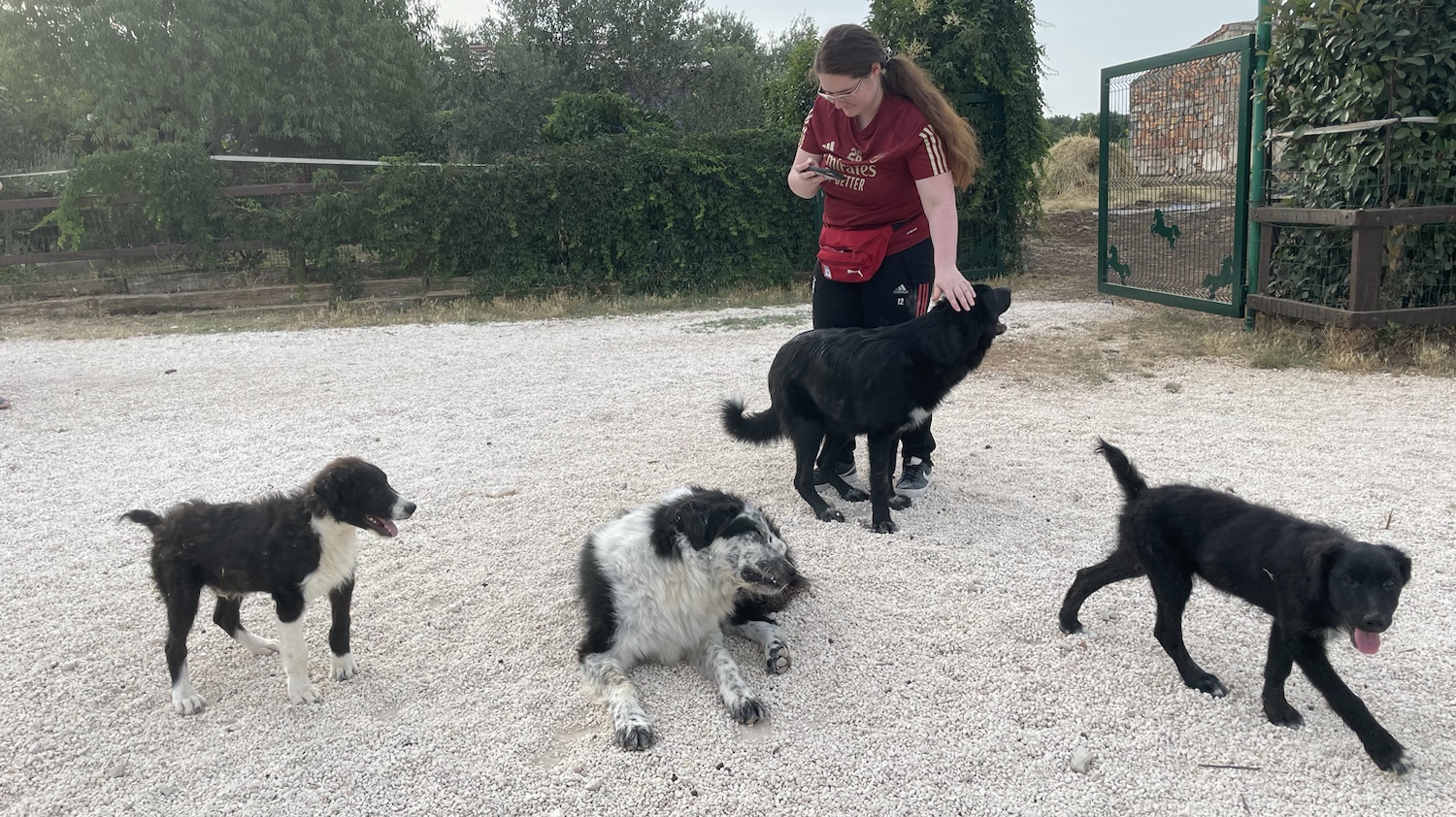 Begrüßt werden wir von vier süßen Mischlings-Welpen und drei erwachsenen Hunden. Die Border Collie Dame vom letzten Jahr ist auch wieder dabei. Wer fehlt ist aber die Pinscher-Mischlings-Hündin, die so gerne mit uns mitgekommen wäre. Wie wir später erfahren, hat sie inzwischen ein neues zu Hause gefunden – deutsche Touristen haben sie mitgenommen, sie lebt jetzt auch wieder auf einem Reiterhof.