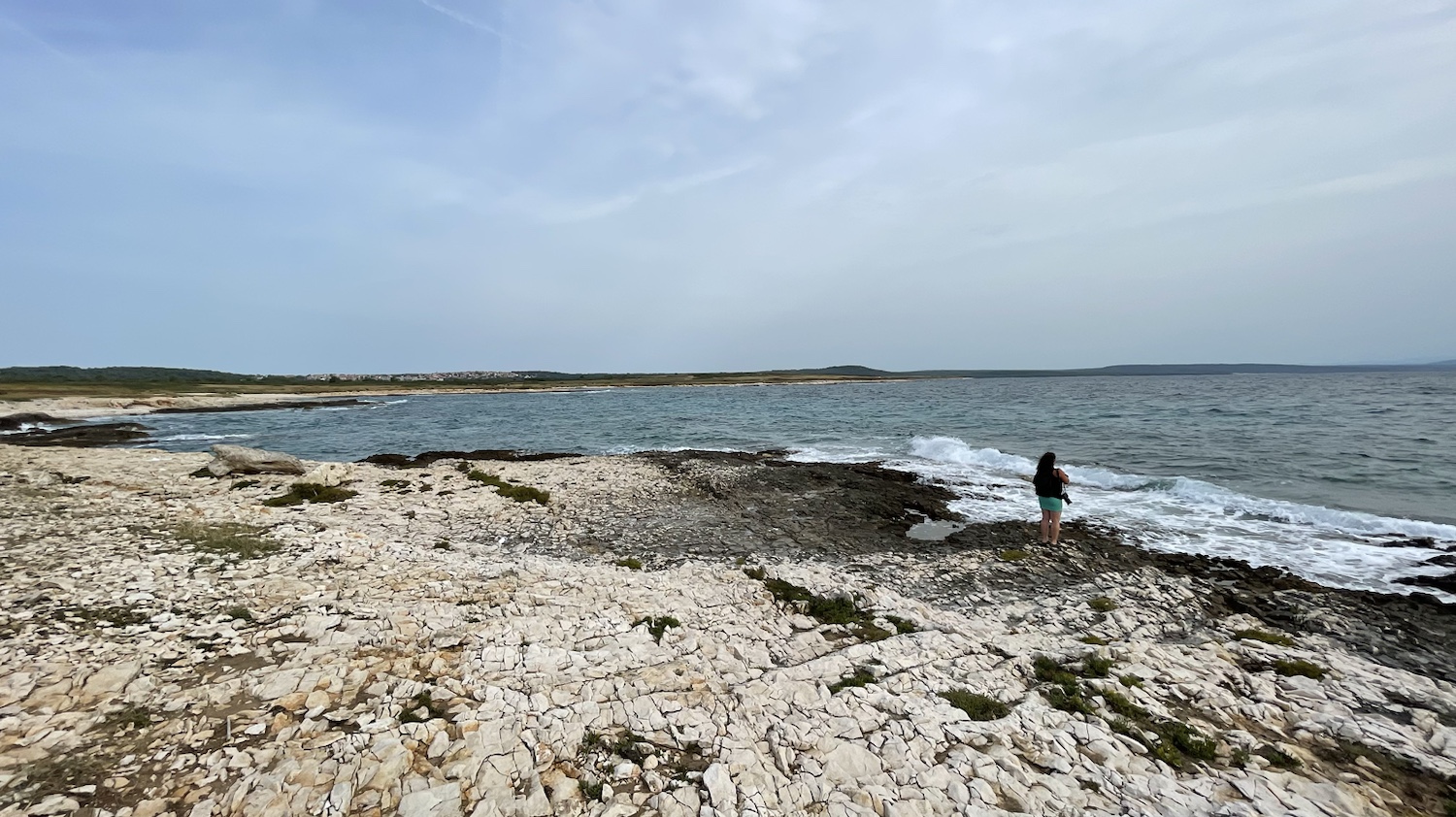 Das Wasser ist auch hier sehr klar und sauber. Es geht flach hinein und wird dann schnell tief. Keine scharfkantigen Steine, wie an den Stränden bei Rovinj. Bella geht aber nur kurz mit den Pfoten ins Wasser. Ihr sind es noch zu viele Wellen. Das ist ihr nicht geheuer.