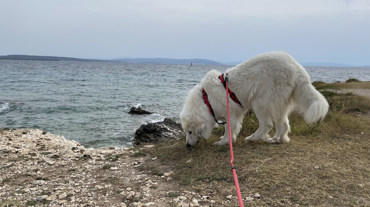 Meine Menschenschwestern sind dann mit den Pferden losgeflitzt und ich bin mit meinen großen Menschen mit meinem weißen französianischen Auto einkleines Stück bis an den riesigen Ozean Adria gefahren. Dort konnte ich dann auch endlich aussteigen. Wir sind dann ein ganzes Stück am riesigen Ozean entlanggelaufen.