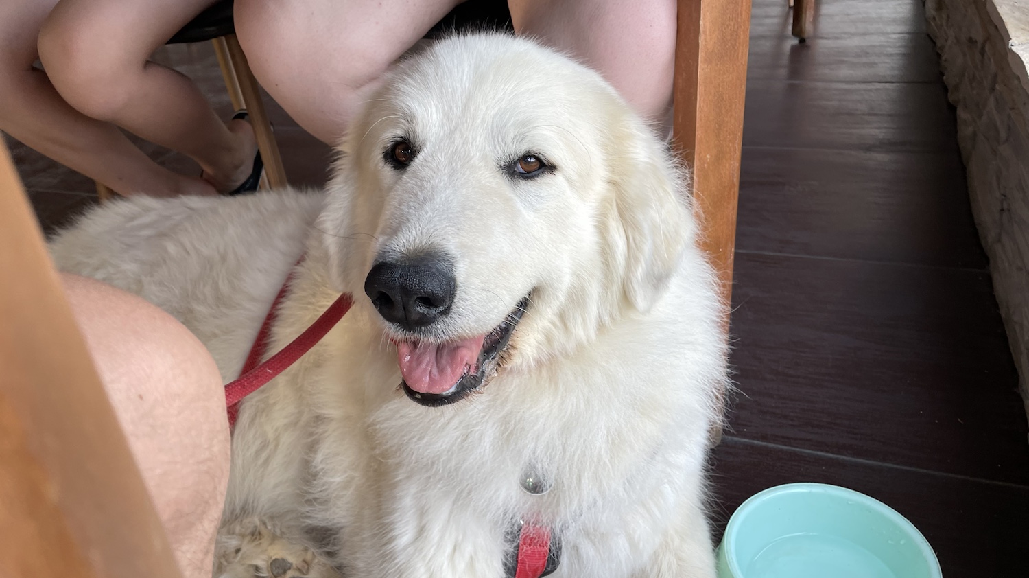 Abends sind meine Menschen dann Pizzaessen gefahren. Ich durfte natürlich mit. Ich habe mich da gleich wieder ganz brav unter einen Tisch gelegt und alles genau beobachtet. Zu Trinken habe ich auch gleich bekommen. Einen großen Napf mit Wasser.