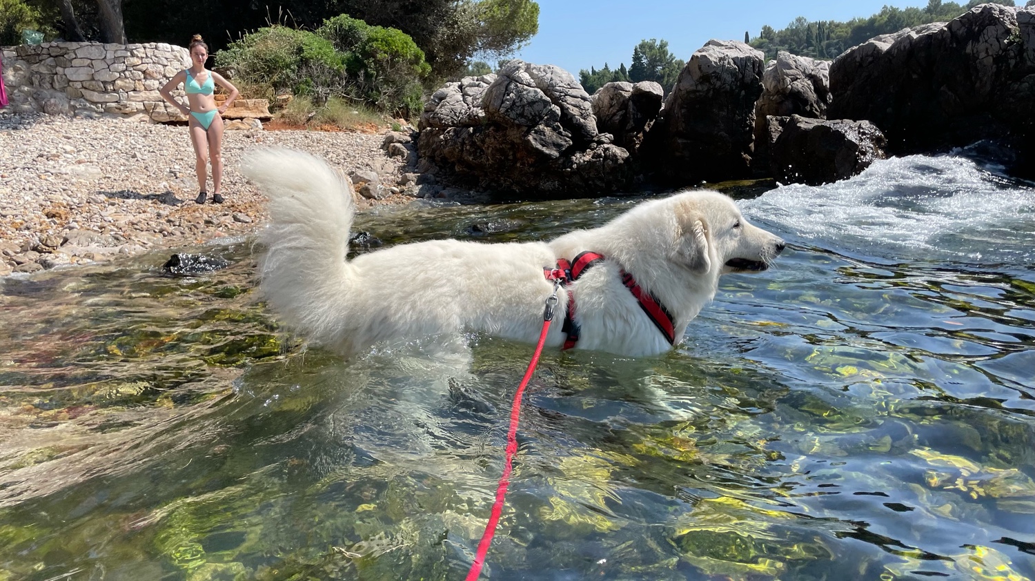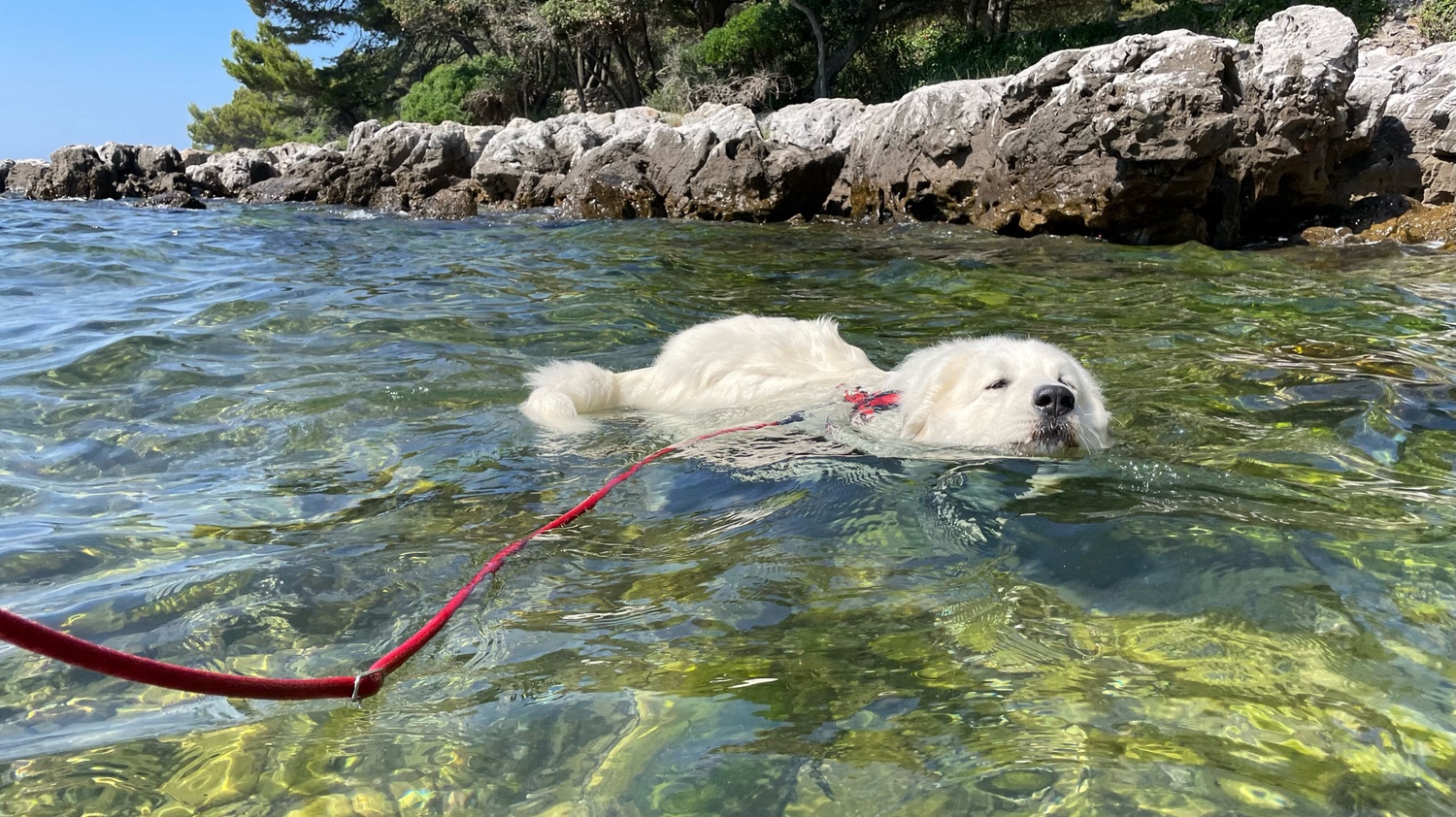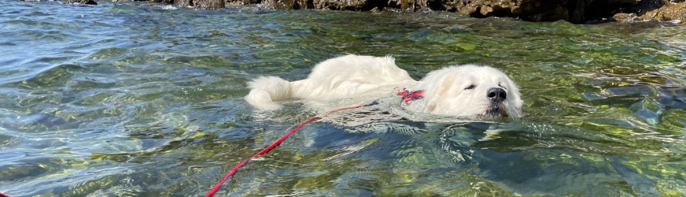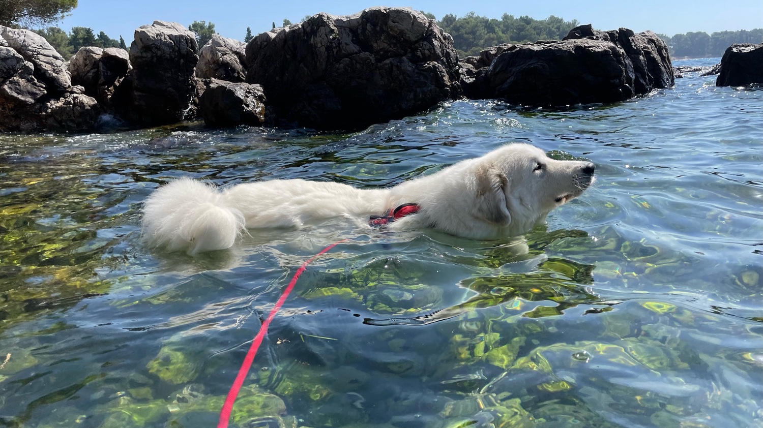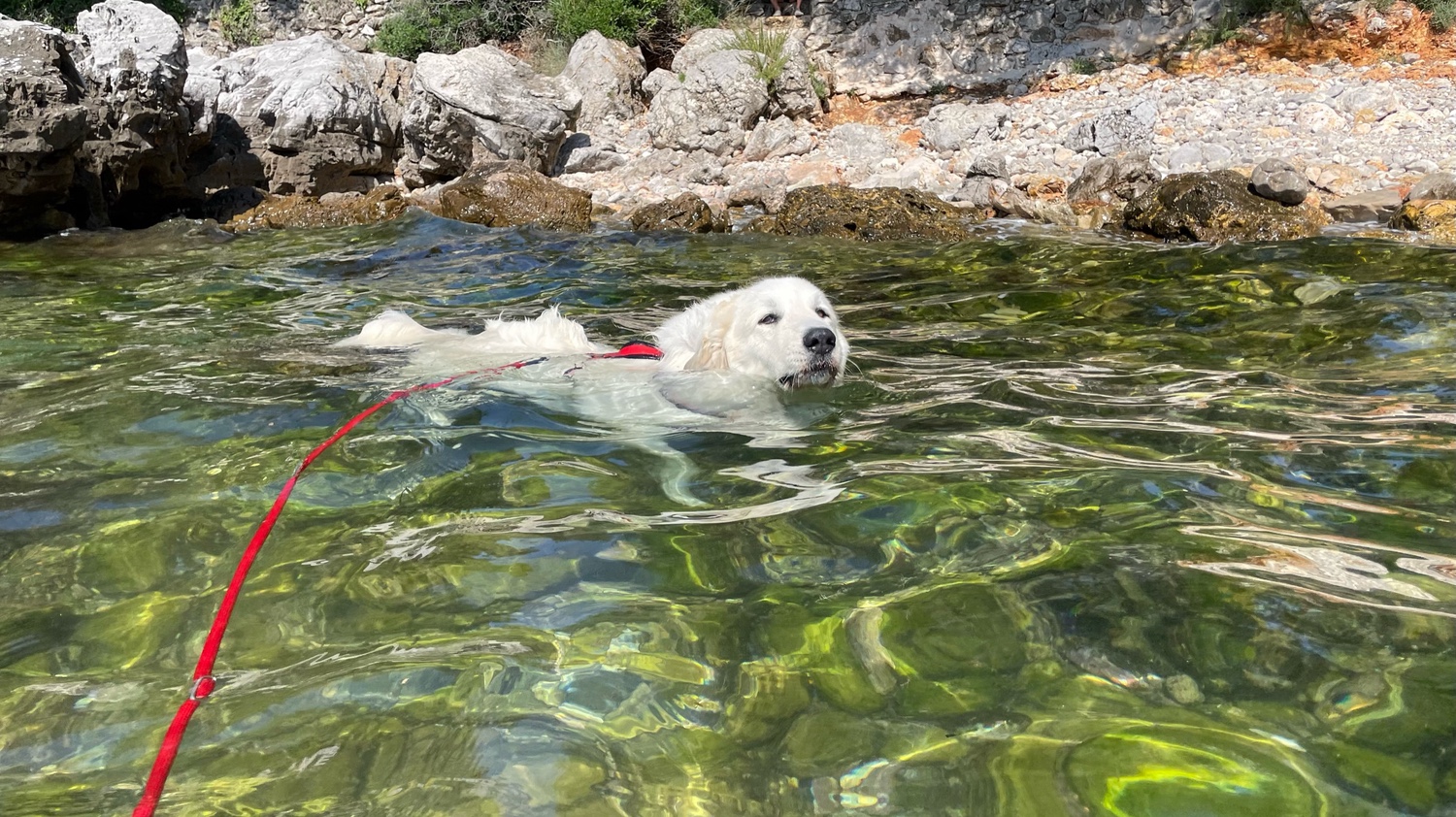 Auch heute gehen wir wieder an den kleinen Hundestrand in der Bucht Korunsun. Dort angekommen gibt es eine Überraschung. Bella, bisher eher zurückhaltend im Kontakt mit der Adria, steuert direkt auf das Wasser zu und geht gleich erstmal zielstrebig eine Runde schwimmen.