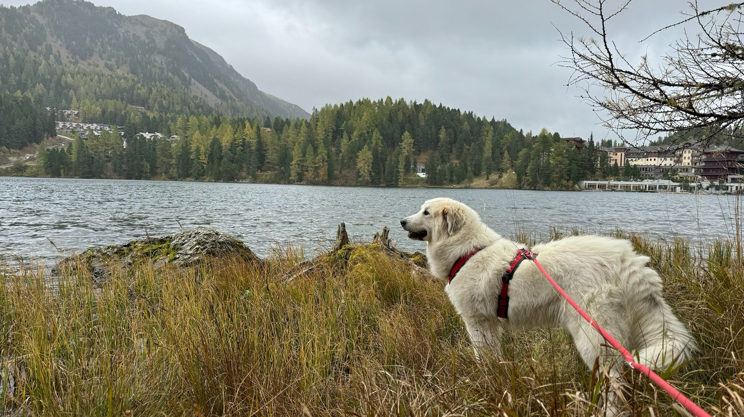 Heute haben wir ganz viele Hunde getroffen. Da war ich aufgeregt, weiiil, das ist doch mein Urlaubssee. Und ich bin ganz viel ins Wasser getrampelt. Das macht auch Spaß.
