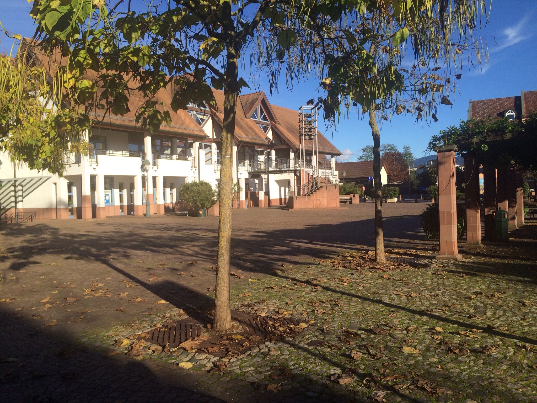 Der Rathausplatz in Neuenburg am Rhein, mit kürbisgefülltem Brunnen im Vordergrund: