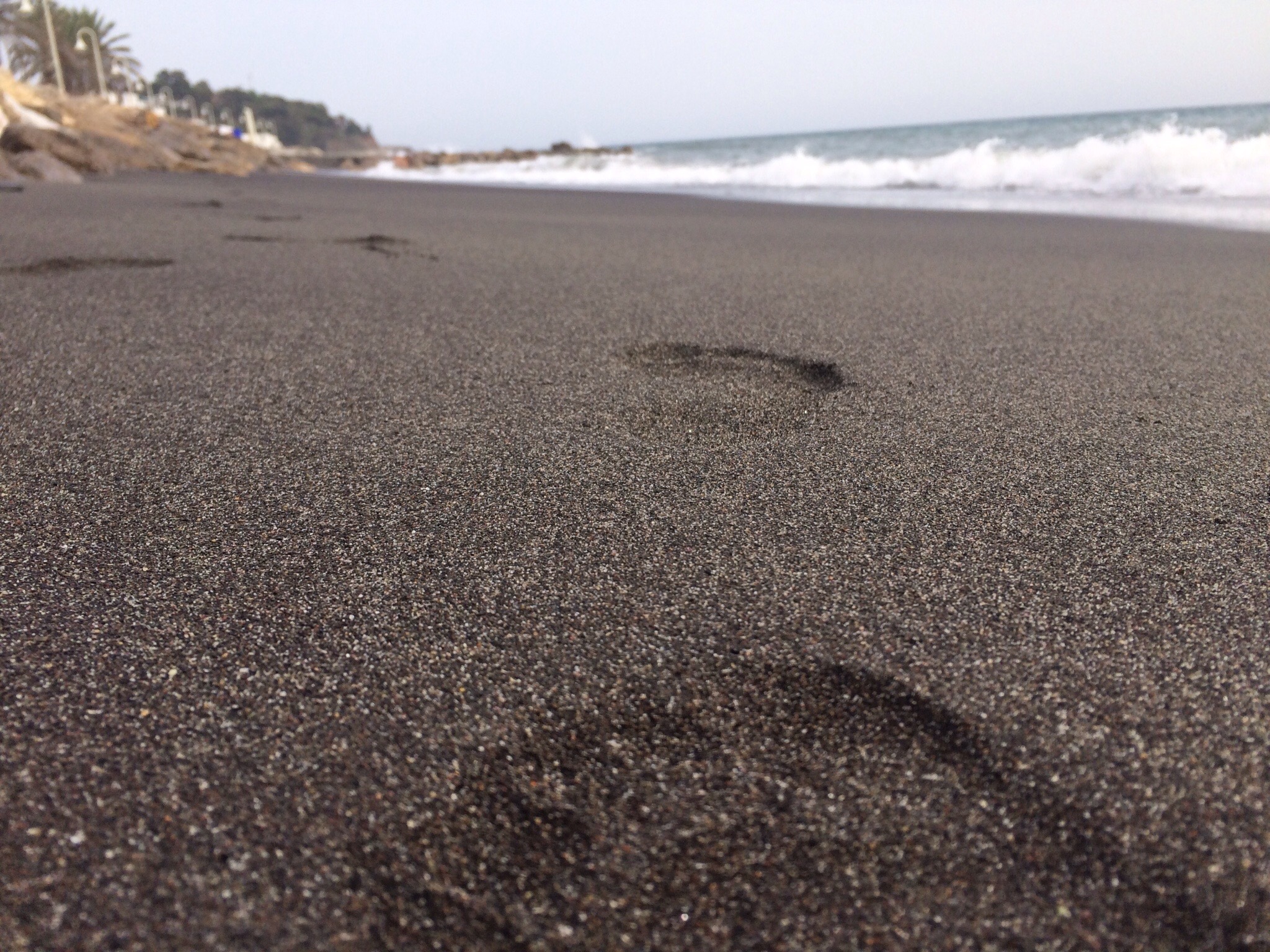 Am Strand – der Strand von Mezquitilla ist ein Gemisch aus Stein/Kies und sehr dunklem, fast schwarzem Sand: