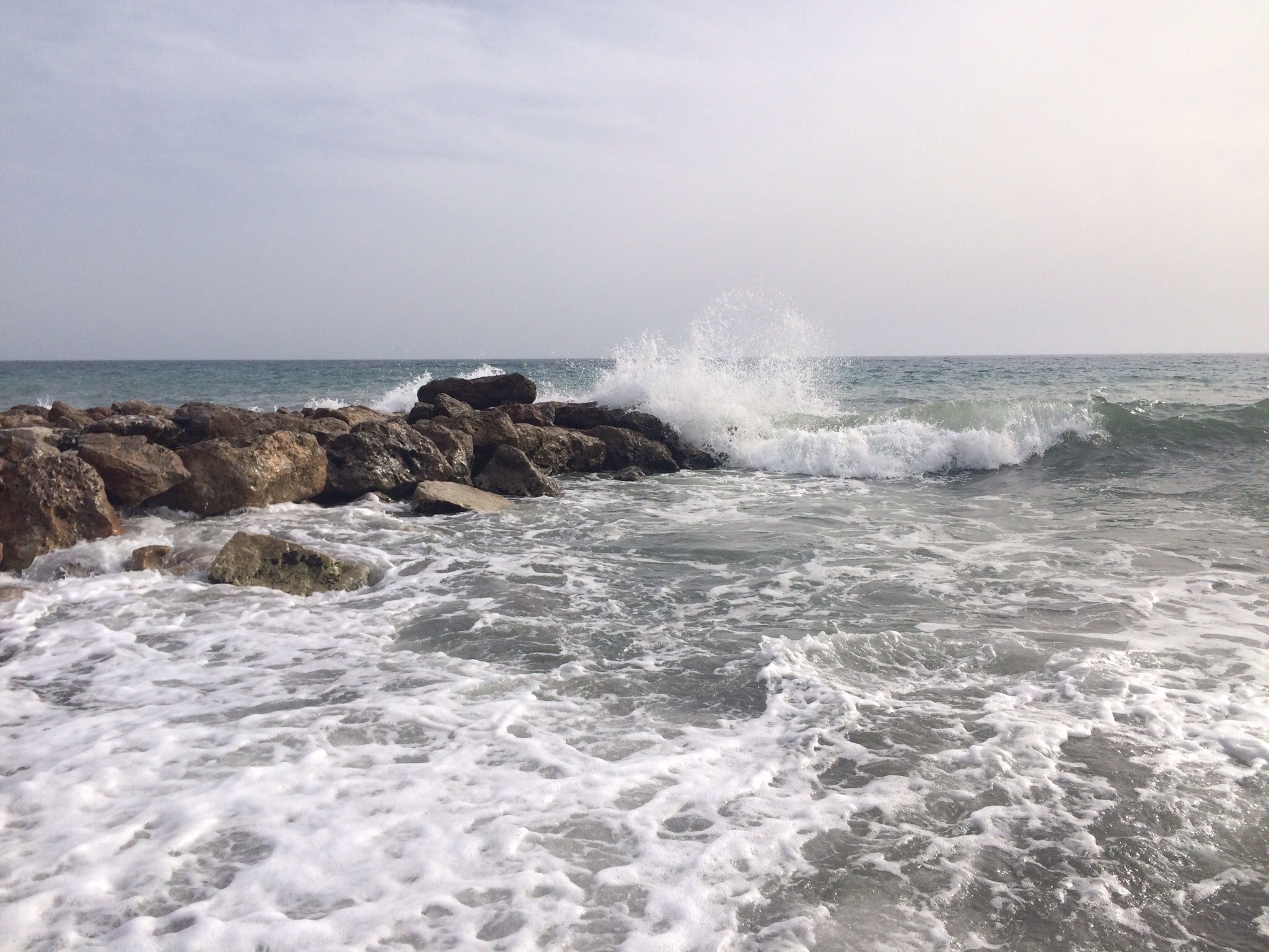 Zur Entschädigung wurden wir aber mit Sonne und 30,5°C begrüßt – wir sind ja extra Ende Oktober gefahren, damit es nicht ganz so heiß wird. Dazu weht aber ein ziemlich kräftiger Wind und das Mittelmeer, keine 5 Minuten Fußweg von unserer Ferienwohnung entfernt, schlägt ordentliche Wellen.