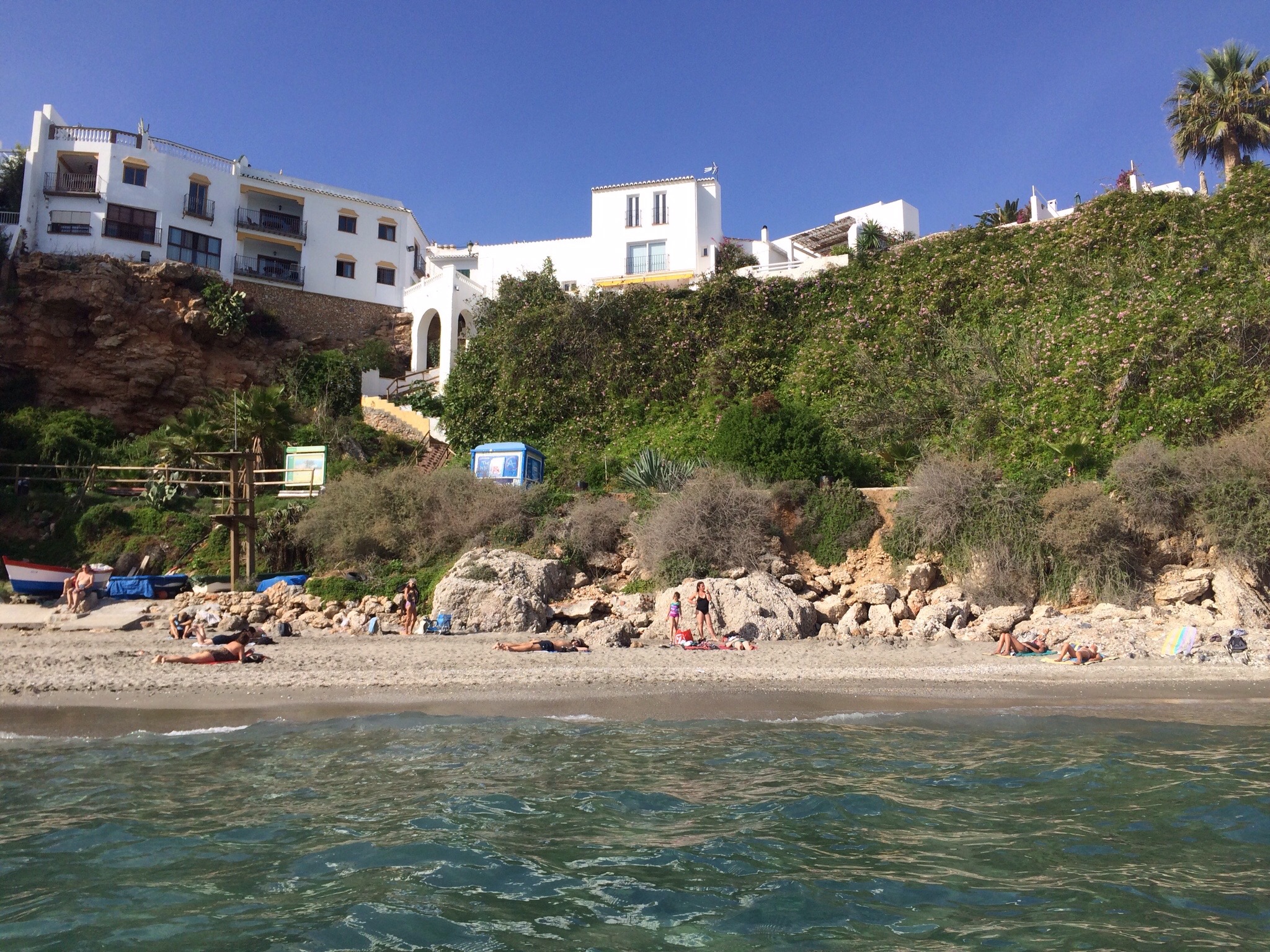 Zum Schluß noch ein kleiner Abstecher an einen der schönen Sandstrände von Nerja, die sich in viele kleine Badebuchten aufteilen. Wir haben uns für Playa Carabeo entschieden. Nach Osten schließen sich die großflächigen Strände Carabeillo Chico und Burriana, nach Westen dann die kleinen Buchten El Chorrillo, Calahonda und westlich des Balcón de Europa noch La Caledilla und El Salón an – alle durch Felsvorsprünge voneinander getrennt.