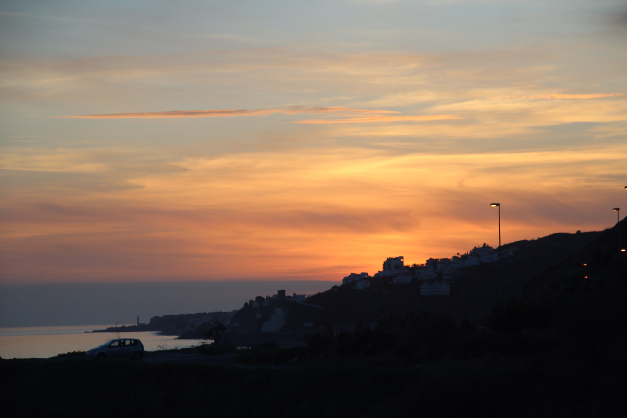 Und als uns der Bus am Abend dann zurück entlang der Küste nach Mezquitilla brachte, ging in Malága bereits die Sonne unter: