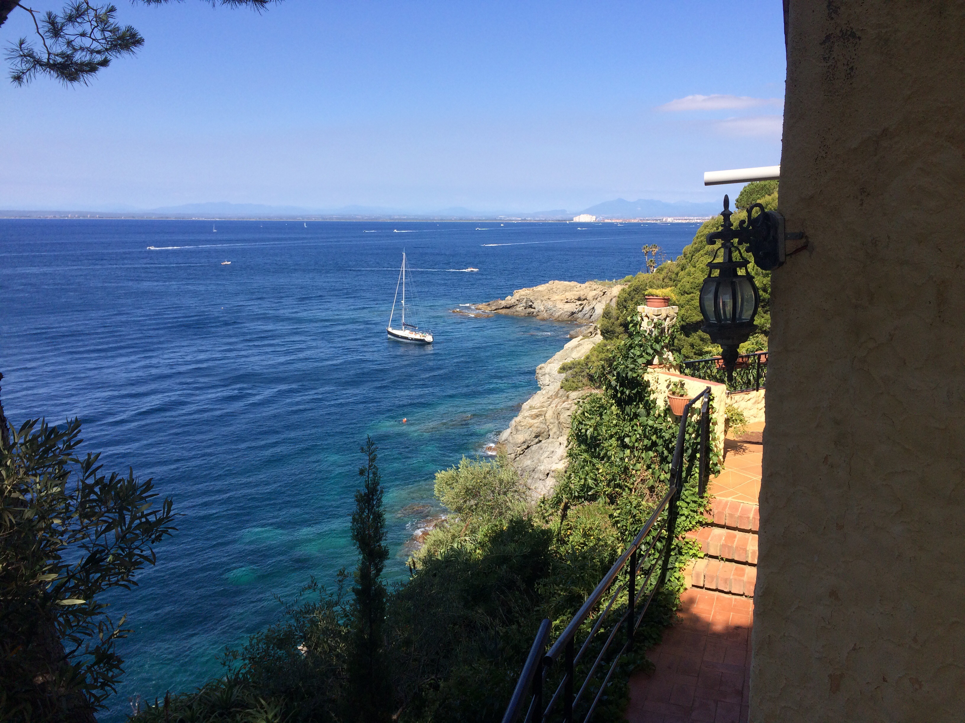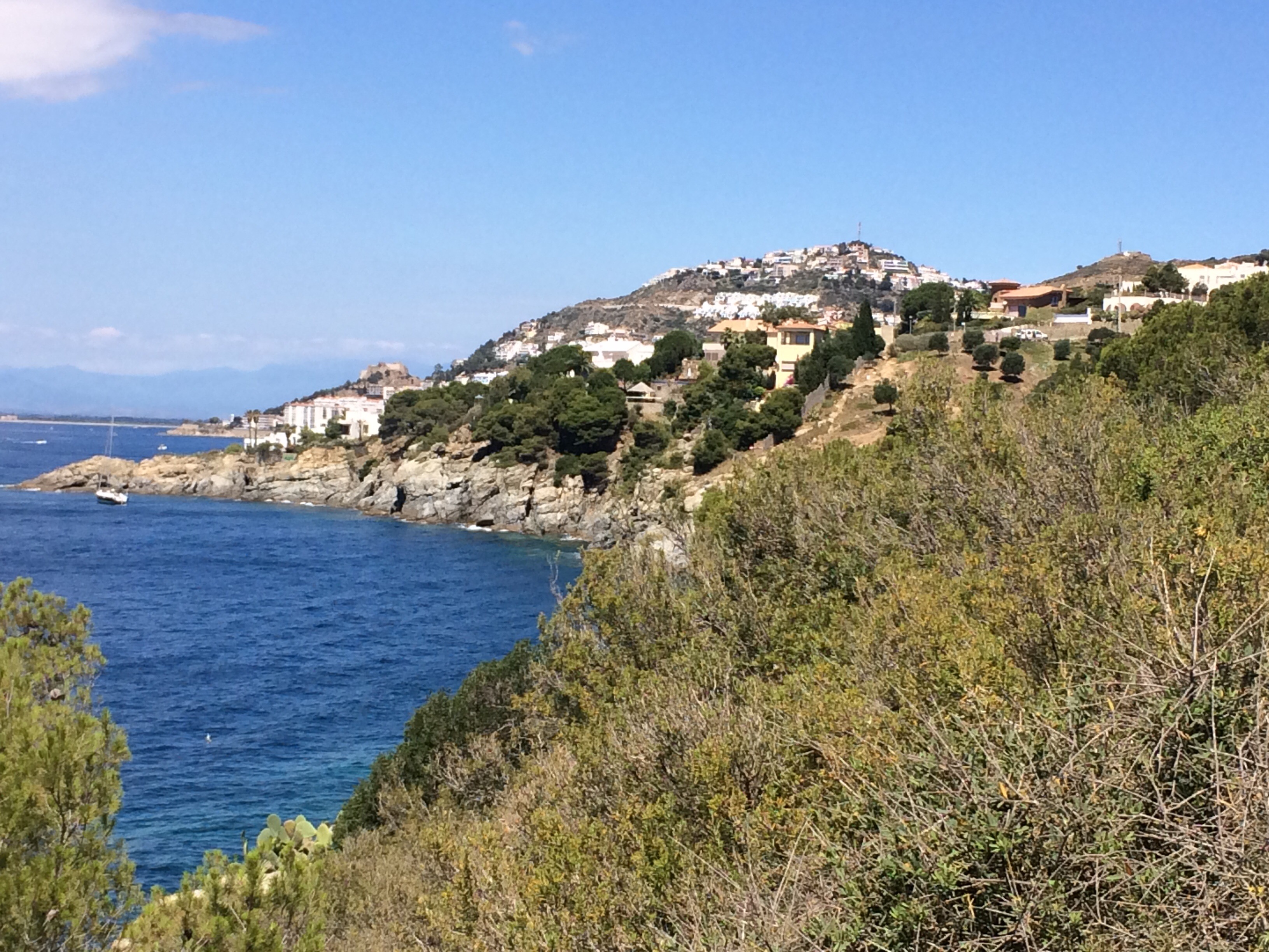 Zurück im Ferienhaus entscheiden wir uns für einen Spaziergang im angrenzenden Naturschutzgebiet. Immer entlang der Küste wandern wir zum Els falcons und ein Stück weiter bis zur Cala del Lledò, einer der zahlreichen kleinen Buchten an der Küste. Vom Wanderweg aus hat man einen herrlichen Blick über das Mittelmeer, die Küstenorte Roses, Empuriabrava und weiter südlich L’Escala und auch auf unser Ferienhaus. Strahlend blauer Himmel, Sonne pur, dabei ein angenehmer leichter Wind, der erst am Nachmittag stärker wird und am Abend für dringend nötige Abkühlung sorgt.